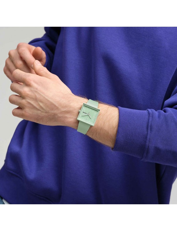 Reloj Swatch What If Mint Unisex SO34G701. La caja es de material biocerámico y mide 42 mm de ancho. Lleva pulsera de origen biológico con hebilla biocerámica. Incluye calendario con día de la semana y del mes. No es sumergible (3ATM) y tiene tres años de garantía.