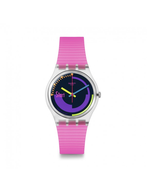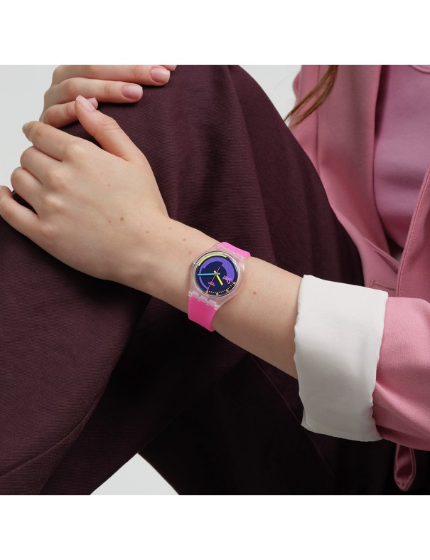 Reloj Swatch Neon Pink Podium SO28K111. La caja es de material de origen biológico y mide 34 mm de diámetro. La pulsera es de silicona con hebilla de plástico. Pertenece a la colección Swatch Neon. No es sumergible (3ATM) y tiene tres años de garantía.