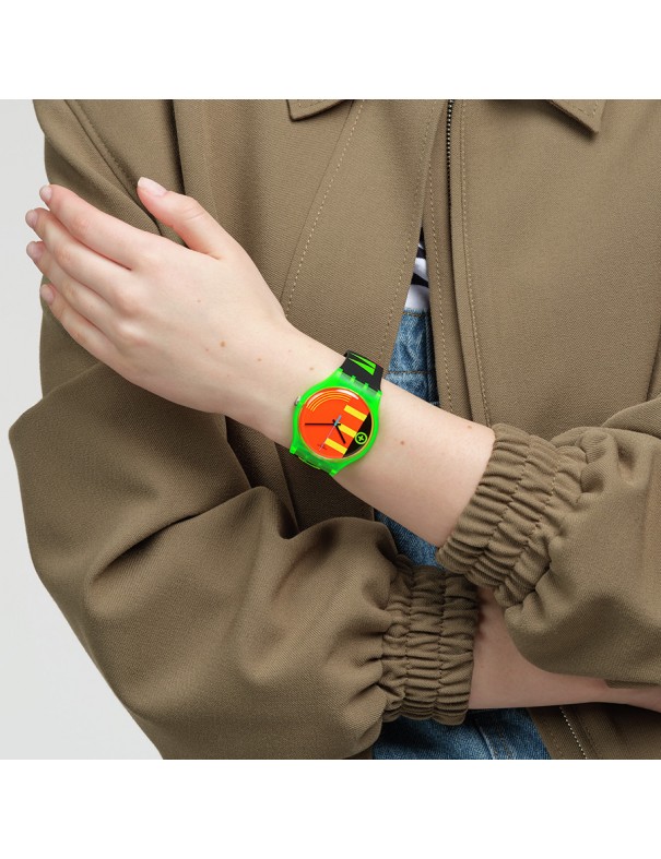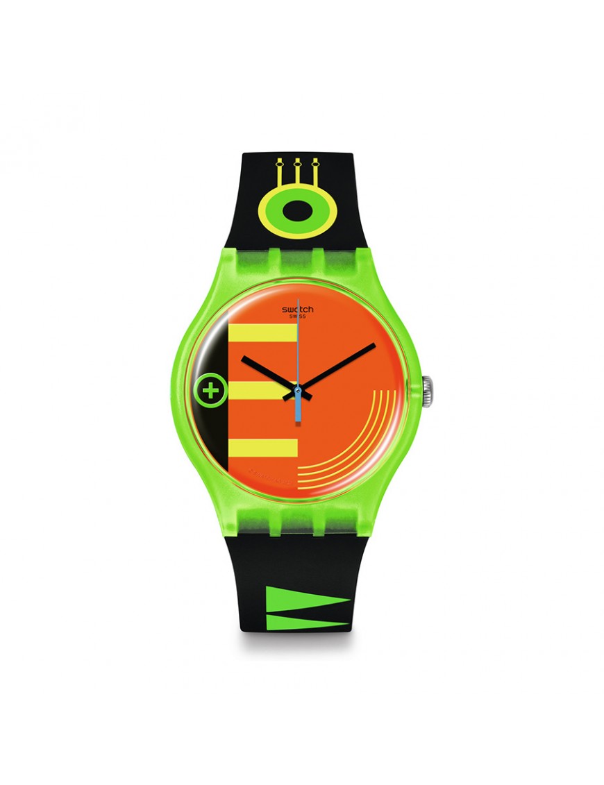 Reloj Swatch Neon Rider SO29G106. La caja es de material de origen biológico y mide 41 mm de diámetro. La pulsera es de silicona con hebilla de plástico. Pertenece a la colección Swatch Neon. Inspirado en un icono Swatch de los 80: el Neo Rider (GG103). No es sumergible (3ATM) y tiene tres años de garantía.