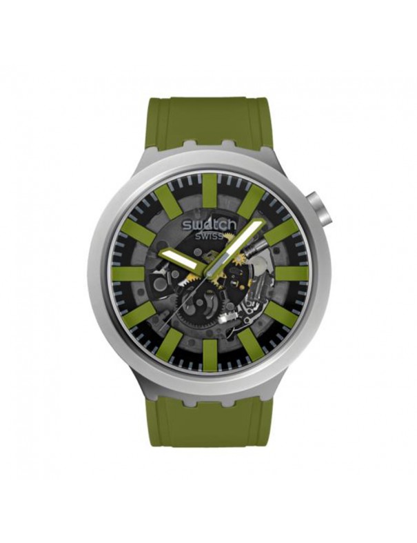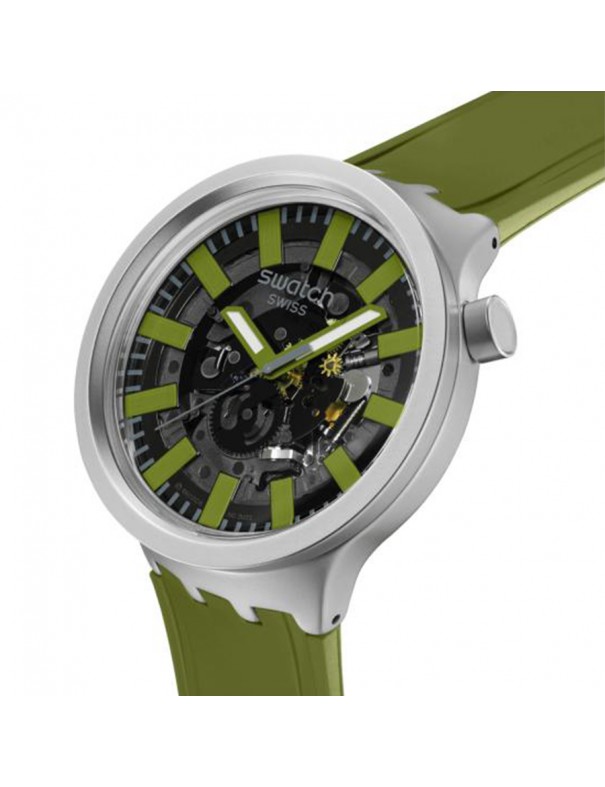 Reloj Swatch Thru The Underbrush SB07S118. La caja es de acero inoxidable y mide 47 mm de diámetro. La pulsera es de caucho verde con hebilla de acero. No es sumergible (3ATM). Garantía de tres años.