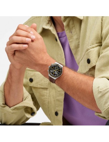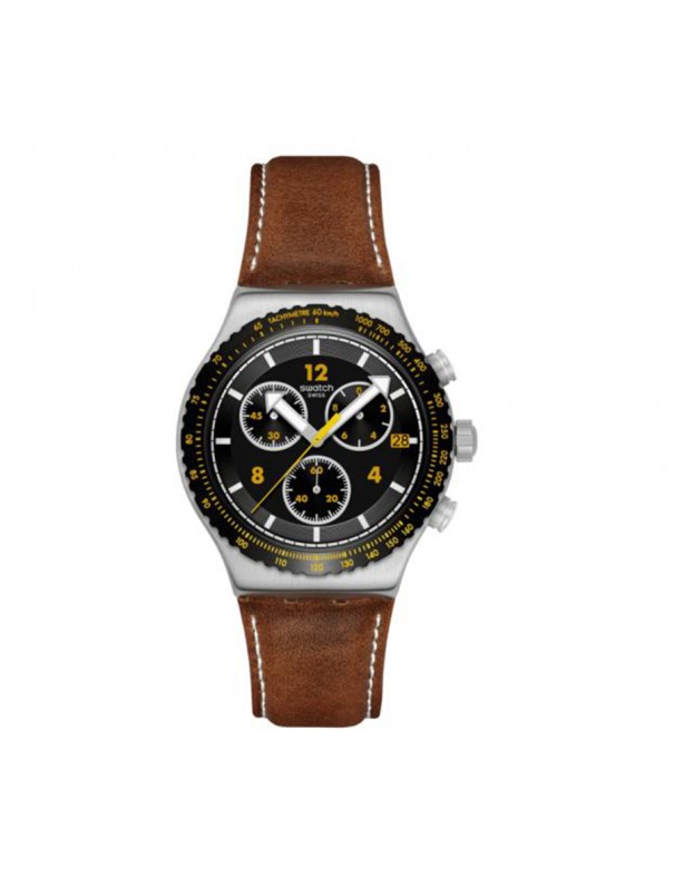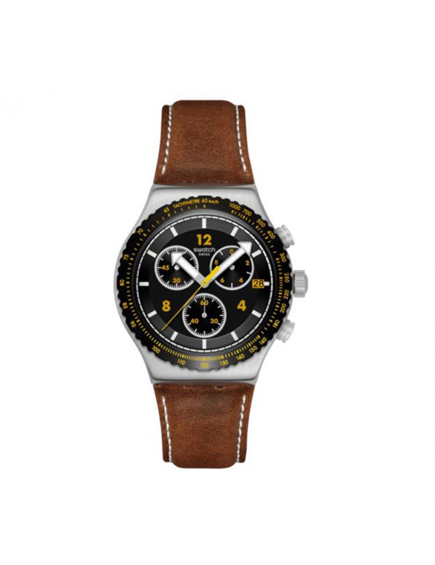 Reloj Swatch Canyon Chaser YVS529. La caja del reloj es de acero y mide 43 mm de diámetro. La pulsera es de cuero marrón y lleva hebilla de acero. Tiene función cronógrafo y calendario. No es sumergible (3ATM) por lo que sólo admite leves salpicaduras. Garantía de tres años.