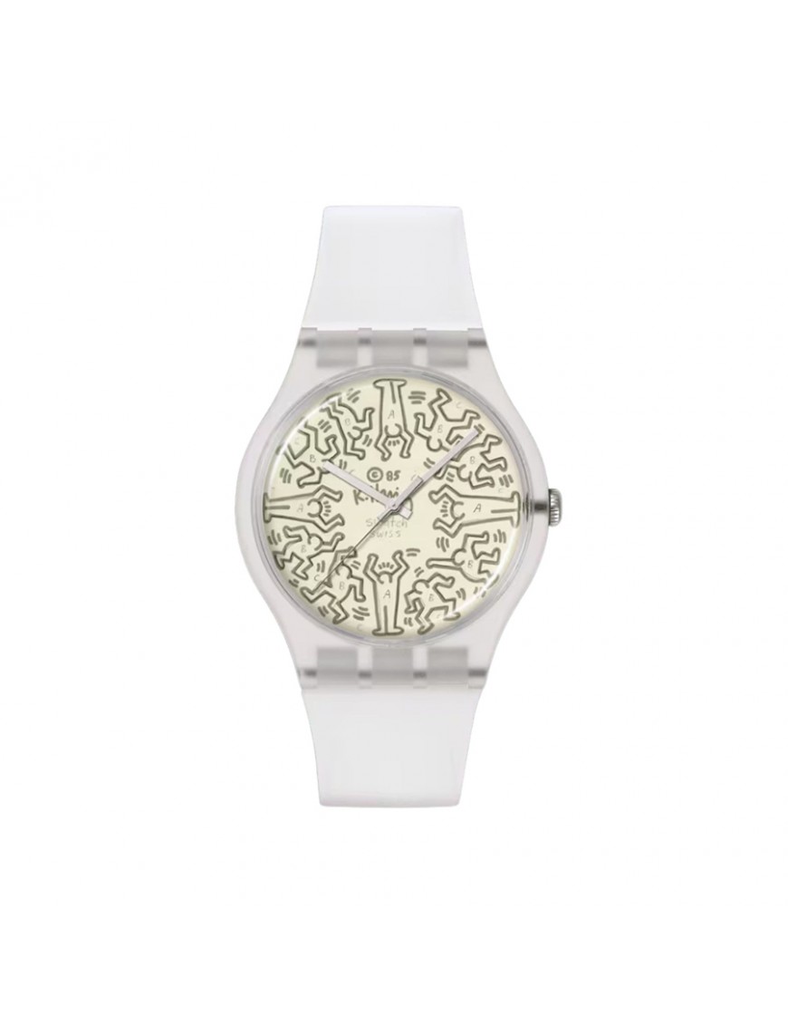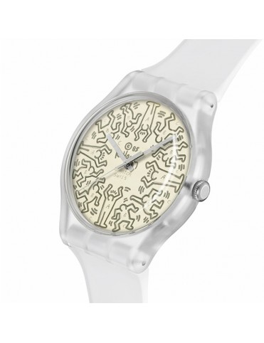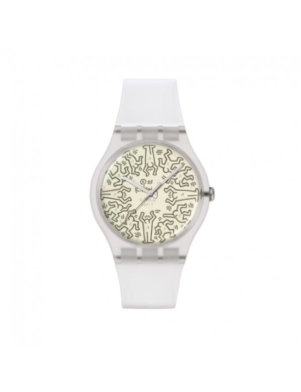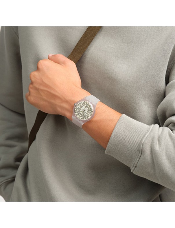 Reloj From The Archive SO29Z145. Caja transparente con acabado mate con cristal de origen biológico con esfera en color beige mate y dibujos grises. Las agujas son plateadas y la correa es de silicona con cierre de hebilla. Resistente al agua hasta 3 bares. Garantía de 3 años.