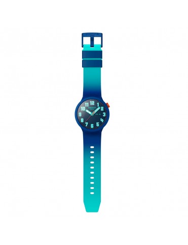 Reloj Essentially Bold SB01N700. Reloj oversize con caja azul mate y esfera en azul oscuro con número en 3D en turquesa. Las agujas en turquesa brillan en la oscuridad y el segundero es de color rojo. La correa cuenta con un diseño en degradado de azul oscuro y turquesa mate. Sumergible hasta 3 bares. Garantía de 3 años.