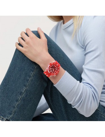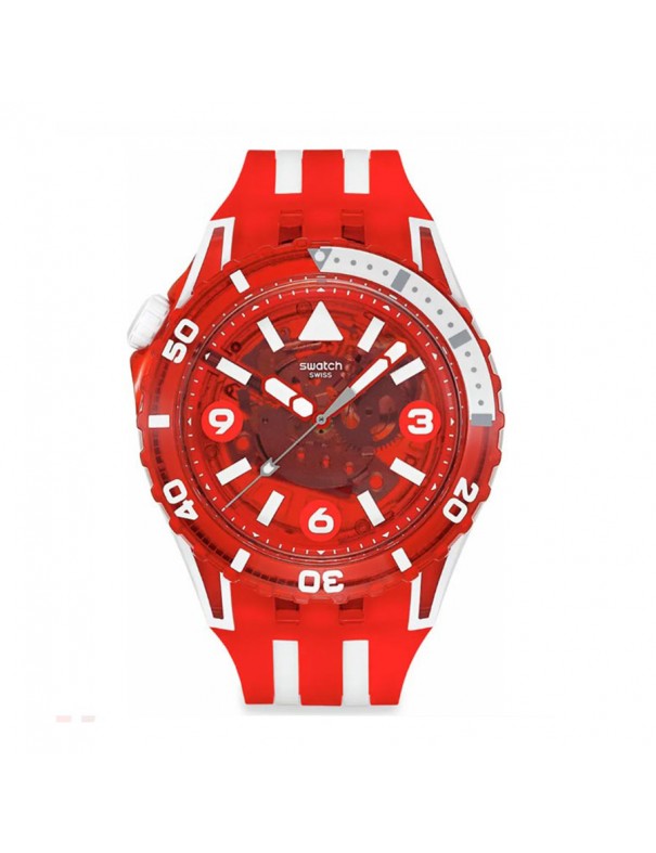 Reloj SWATCH LION´S MANE SSCU09R100. Fabricado con Bioceramic blanco mate y materiales de origen biológico en rojo transparente brillante. Tiene una esfera roja transparente con agujas luminiscentes, bisel y correa a rayas en rojo y blanco, también de materiales sostenibles. Funciona con movimiento de cuarzo, es resistente al agua hasta 10 bares y brilla en la oscuridad.