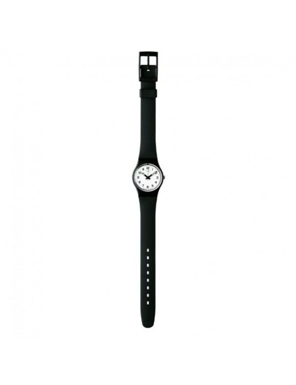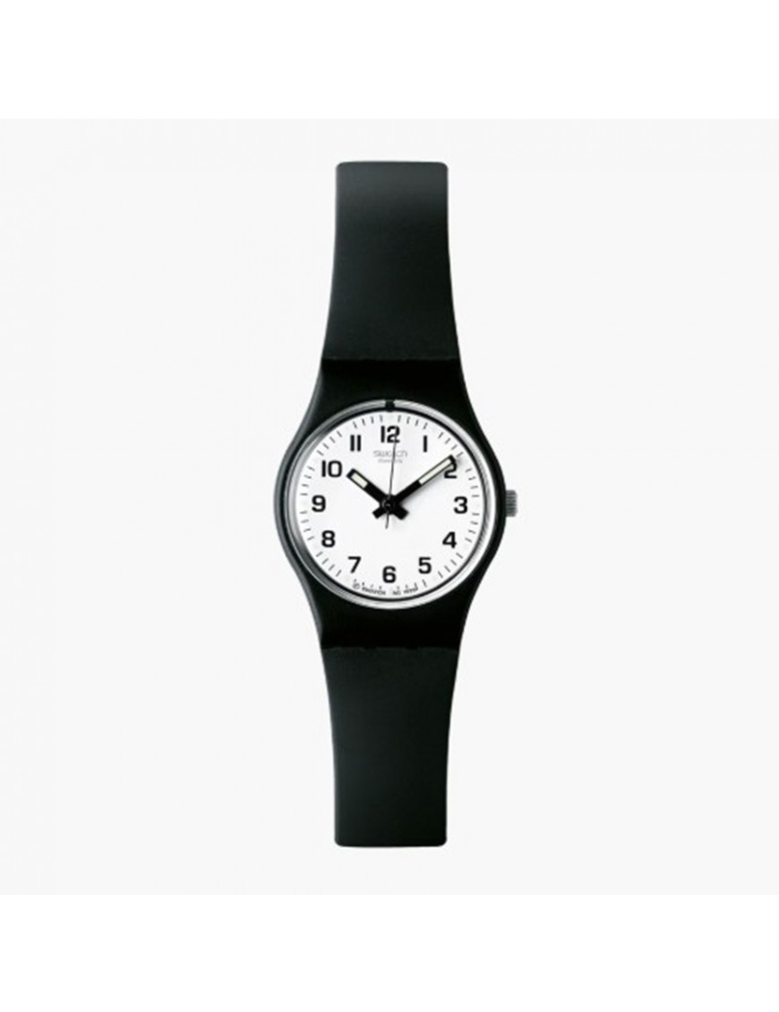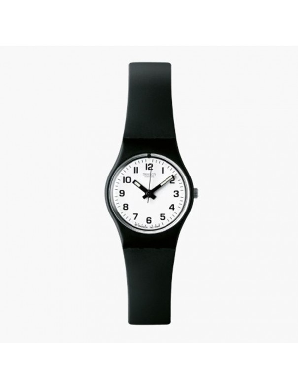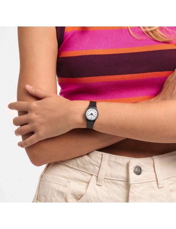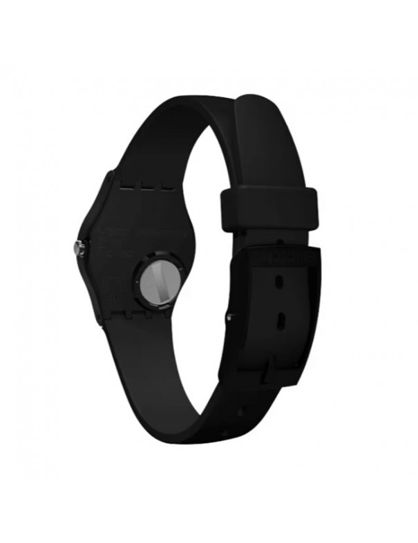 Reloj SWATCH Something New LB153. Fabricado con caja de plástico de color negro y correa de resina o plástico negro, con cierre de hebilla convencional. Incluye movimiento de cuarzo, su resistencia al agua es de 3 bar.