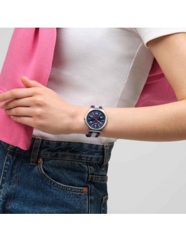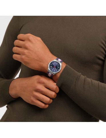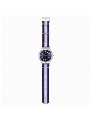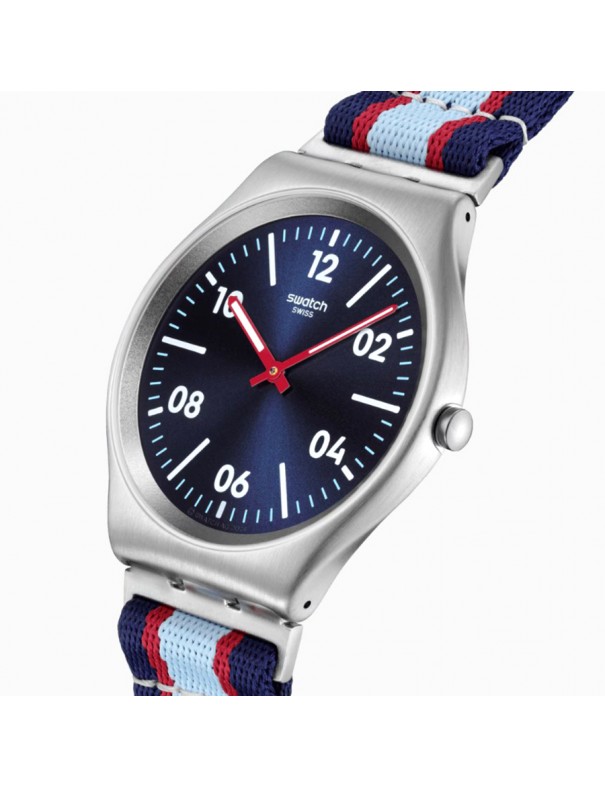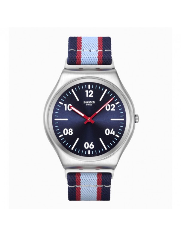 Reloj SWATCH BESIDE THE SEA SS07S148. Reloj ultrafino con esfera azul oscuro, reborde plateado, índices y números blancos, y una pista de minutos azul claro. Las agujas horaria y minutera son burdeos y brillan en la oscuridad. Su caja de acero inoxidable arenado de 42 mm de diámetro y correa textil de rayas en azul oscuro, burdeos y azul claro, con cierre de hebilla de acero inoxidable, le dan un toque elegante y cómodo. Este reloj pertenece a la colección SKIN, con un grosor de solo 6,7 mm.