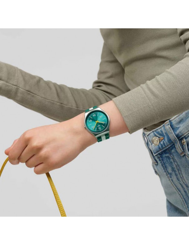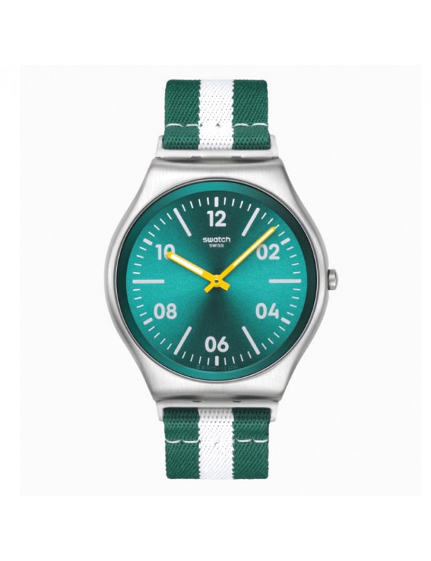 Reloj SWATCH CASUAL STRIPE SS07S149. Reloj ultrafino de 42 mm de diámetro con una esfera verde, reborde verde e índices, números y pista de minutos en blanco. Las agujas en color amarillo brillan en la oscuridad. La caja de acero inoxidable arenado y la correa textil de rayas verdes y blancas se complementan con una hebilla de acero inoxidable. Perteneciente a la colección SKIN, con un grosor de 6,7 mm. Garantía de 3 años.