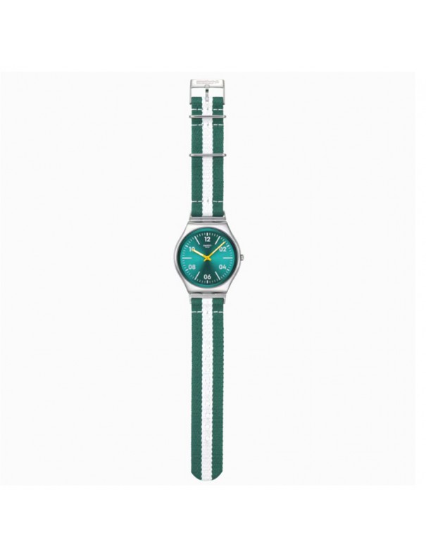 Reloj SWATCH CASUAL STRIPE SS07S149. Reloj ultrafino de 42 mm de diámetro con una esfera verde, reborde verde e índices, números y pista de minutos en blanco. Las agujas en color amarillo brillan en la oscuridad. La caja de acero inoxidable arenado y la correa textil de rayas verdes y blancas se complementan con una hebilla de acero inoxidable. Perteneciente a la colección SKIN, con un grosor de 6,7 mm.