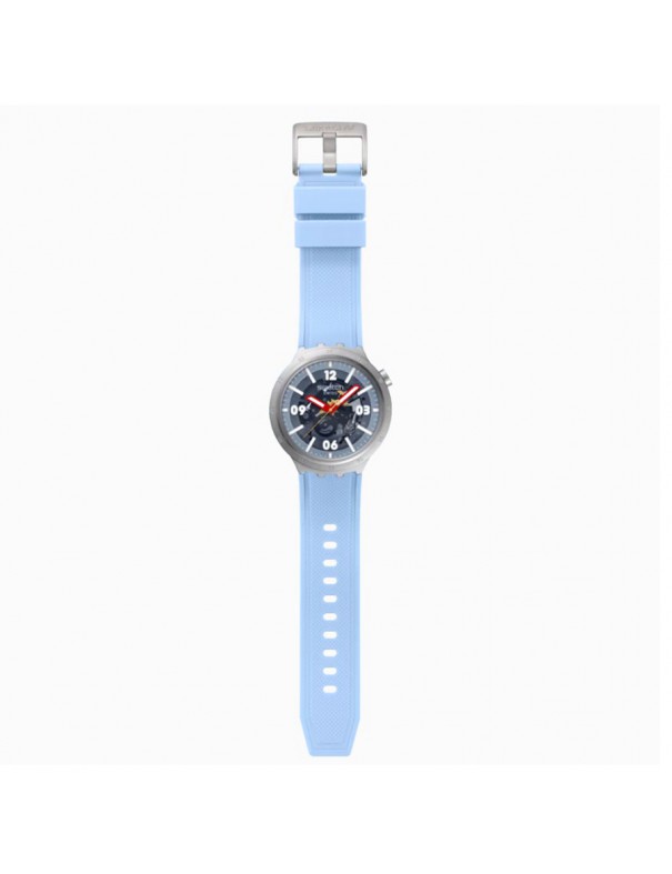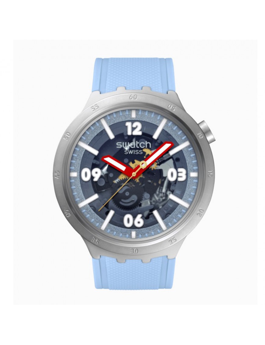 Reloj SWATCH BIG BOLD MOMENTS SB07S122. Reloj oversize con una esfera transparente de 47 mm de diámetro y anillo azul claro. Tiene índices y números blancos que brillan en la oscuridad, agujas rojas y segundero dorado. La caja de acero inoxidable arenado se complementa con una correa texturizada azul claro y cierre de media hebilla.