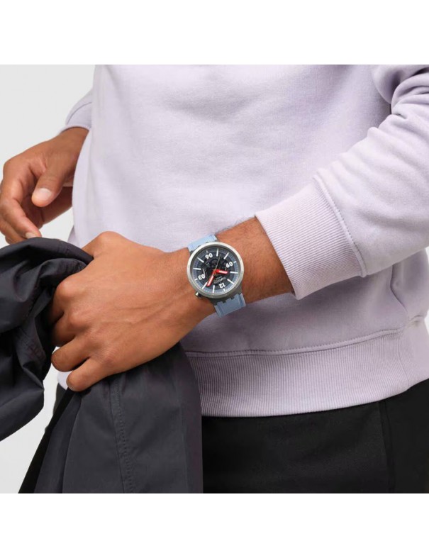 Reloj SWATCH BIG BOLD MOMENTS SB07S122. Reloj oversize con una esfera transparente de 47 mm de diámetro y anillo azul claro. Tiene índices y números blancos que brillan en la oscuridad, agujas rojas y segundero dorado. La caja de acero inoxidable arenado se complementa con una correa texturizada azul claro y cierre de media hebilla. Garantía de 3 años.