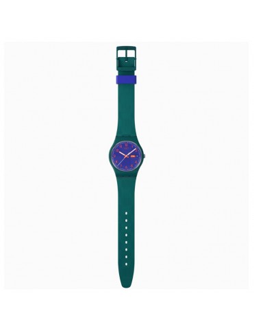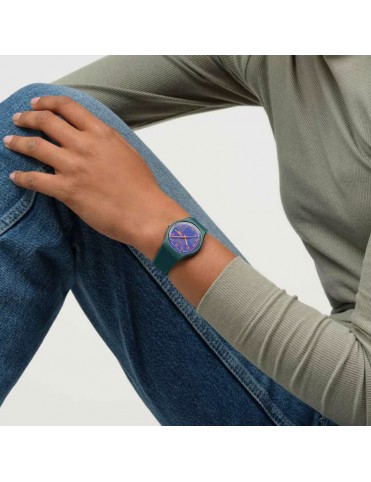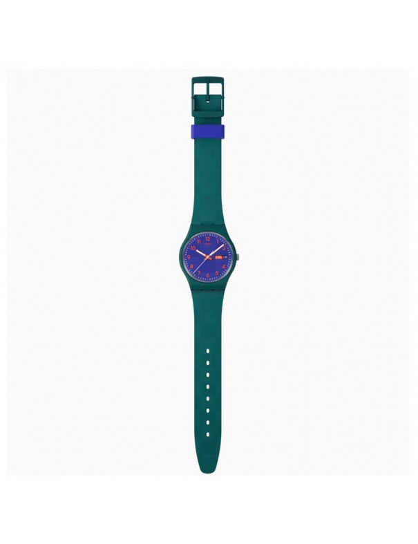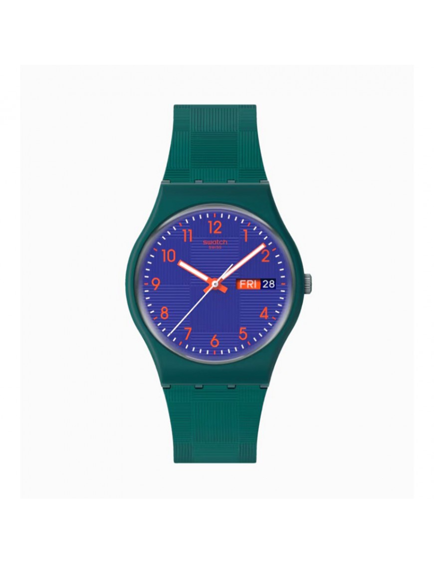 Reloj SWATCH PATTERN FORMATION SO28N706. Cuenta con esfera azul texturizada de 34 mm de diámetro con números naranjas, pista de minutos en azul y naranja, y un indicador de día y fecha. Las agujas naranjas brillan en la oscuridad. La caja verde mate de material biológico se complementa con una correa verde de silicona y cierre de hebilla. Perteneciente a la colección Originals. Garantía de 3 años.