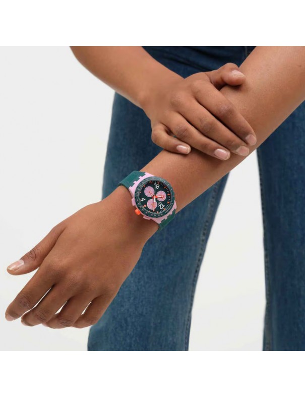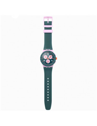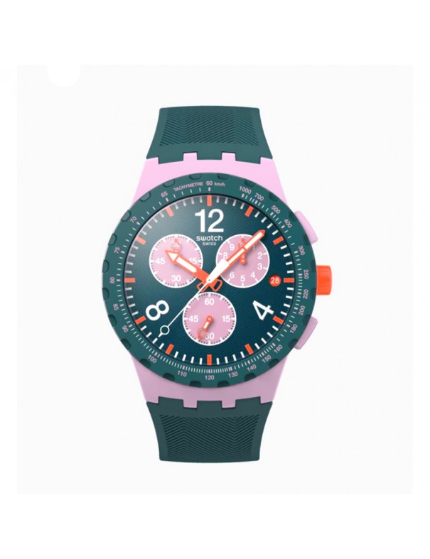 Reloj SWATCH MOMENTOF ROSE SUSP400. Cronógrafo con esfera texturizada verde oscuro, números en blanco y una pista de minutos en blanco y naranja. Las subesferas rosas con agujas naranjas brillan en la oscuridad. La caja rosa mate se combina con un bisel verde oscuro mate. La correa texturizada verde oscuro, con hebilla y trabilla rosa mate, completa el diseño. Diámetro de 42 mm.