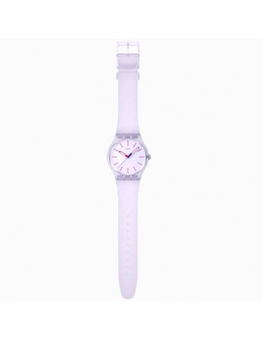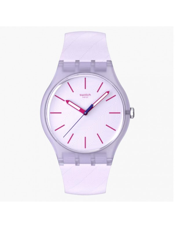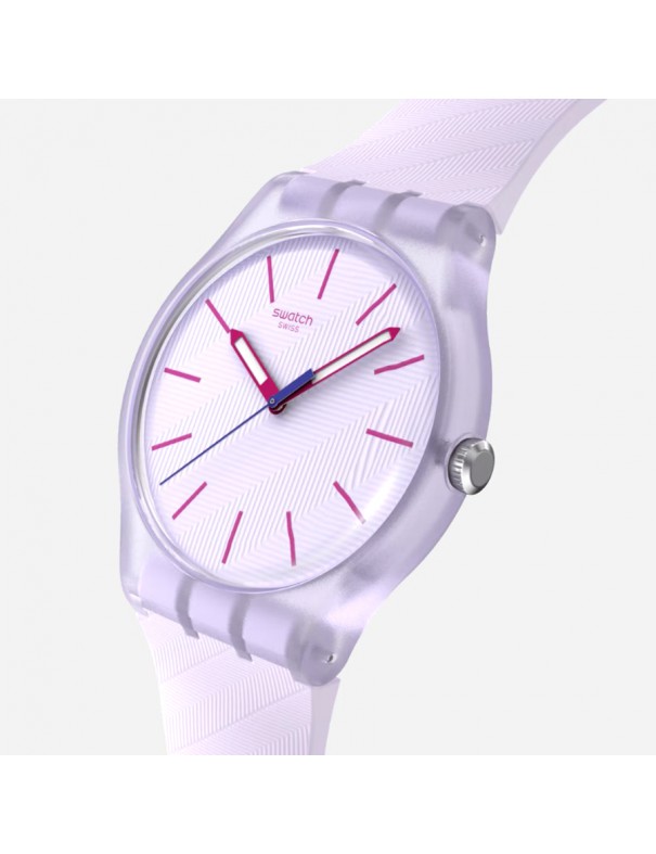 Reloj SWATCH Lavendaze SO29V101. Caja de material de origen biológico en tono morado claro mate transparente con diámetro 41 mm, esfera texturizada morado claro con índices en rosa oscuro, agujas horaria y minutero rosa oscuro luminiscentes. Correa texturizada de silicona morado claro mate con hebilla y trabilla del mismo tono. Movimiento de cuarzo suizo con cristal tipo acrílico. Resistente al agua hasta 3 ATM.