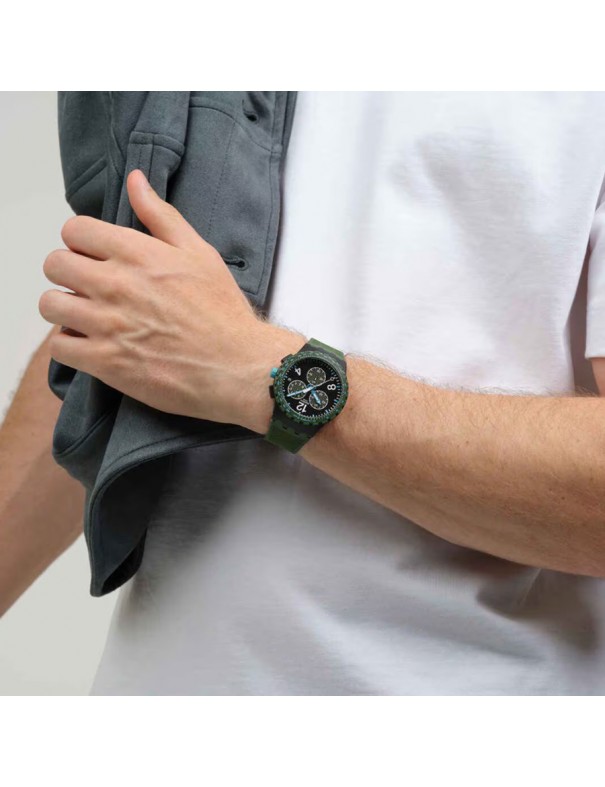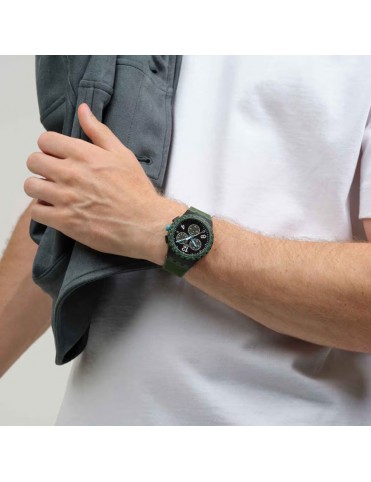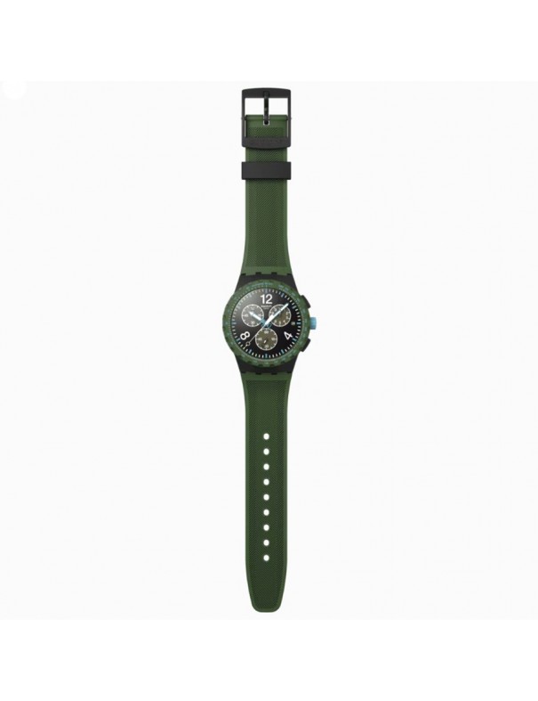 Reloj SWATCH Olive Rush SUSB421. Caja de resina en negro opaco, esfera con textura negra y detalle en verde oliva y azul-blanco, correa de silicona verde oliva con cierre de hebilla, funciones de cronógrafo, fecha y taquímetro, resistencia al agua hasta 3 bar. Garantía de 3 años.