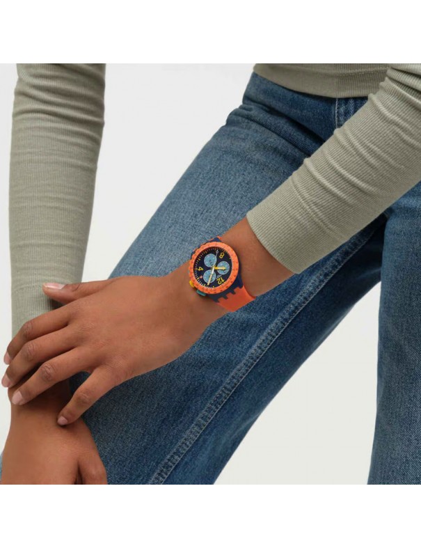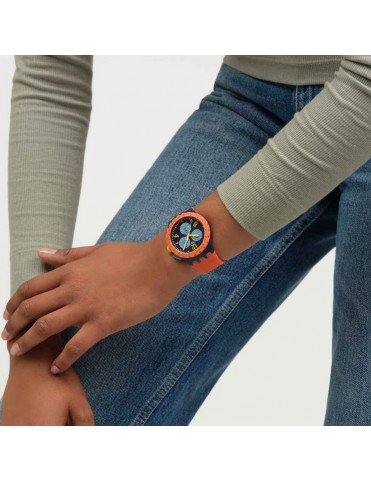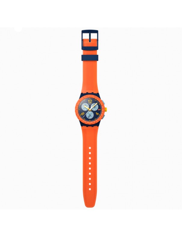 Reloj SWATCH Camo Flash SUS1400. Caja de resina en color azul oscuro mate, esfera azul con números amarillos y subesferas azul claro, correa de silicona naranja con textura y cierre de hebilla azul oscuro. Funciones de cronógrafo, taquímetro, día y fecha. Resistencia al agua hasta 3 bares.