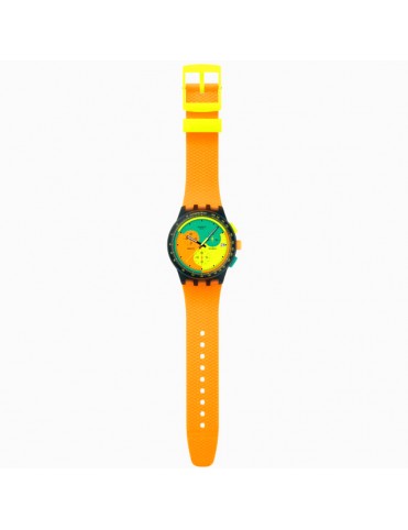 Reloj SWATCH Neon Signal Flag SUSB422. Caja de resina de color negro opaco transparente, esfera multicolor con detalles en negro, amarillo y naranja, correa de silicona texturizada naranja con cierre de hebilla amarilla, funciones de cronógrafo, ventana de fecha, taquímetro y resistencia al agua hasta 3 bar. Garantía de 3 años.
