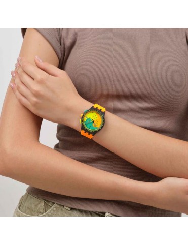 Reloj SWATCH Neon Signal Flag SUSB422. Caja de resina de color negro opaco transparente, esfera multicolor con detalles en negro, amarillo y naranja, correa de silicona texturizada naranja con cierre de hebilla amarilla, funciones de cronógrafo, ventana de fecha, taquímetro y resistencia al agua hasta 3 bar.