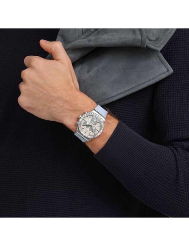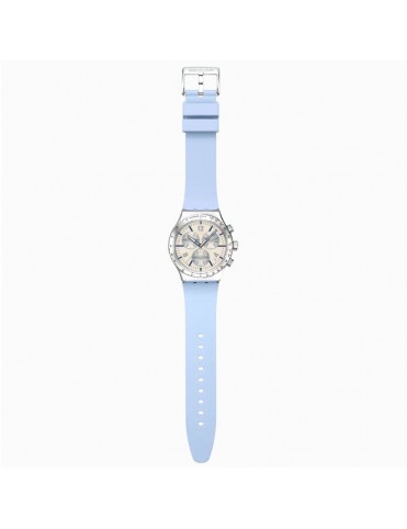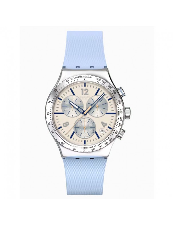 Reloj SWATCH Blueshift Glow YVS536. Reloj cronógrafo con caja de acero inoxidable pulido y bisel con taquímetro grabado en negro. Esfera que cambia de marfil a azul claro, subesferas cepilladas, números plateados e índices azul oscuro. Agujas azul oscuro luminiscentes y segundero dorado Cuenta con ventana de fecha. Correa texturizada de caucho azul claro con cierre de media hebilla en acero. Movimiento de cuarzo con cronógrafo, fecha y taquímetro. Sumergible hasta 3 bar.