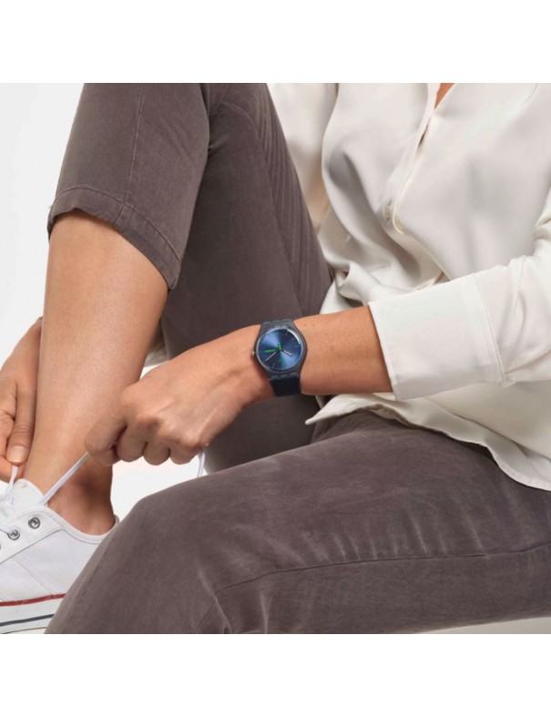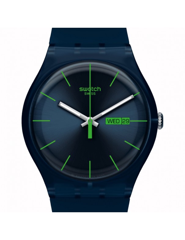Reloj SWATCH Blue Rebel SUON700&SO29N704. Reloj unisex con caja y correa de silicona azul de origen biológico y cierre de hebilla a juego. Monta un movimiento de cuarzo suizo con visualización analógica de horas, minutos, segundos, día y fecha. Su esfera azul con detalles verdes ofrece un estilo moderno y juvenil.