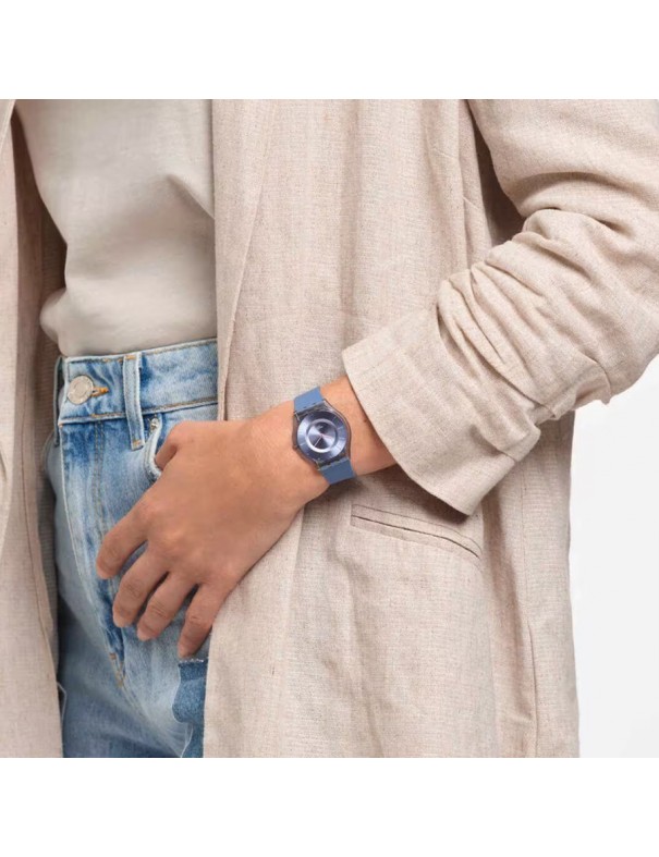 Reloj SWATCH Denim Blue SS08N100-S14. Caja redonda de plástico de origen biológico azul de 34 mm y esfera azul sin función de fecha. Cuenta con movimiento de cuarzo. La correa de silicona azul se ajusta con cierre de hebilla tradicional, ideal para uso diario con estilo moderno y ligero.