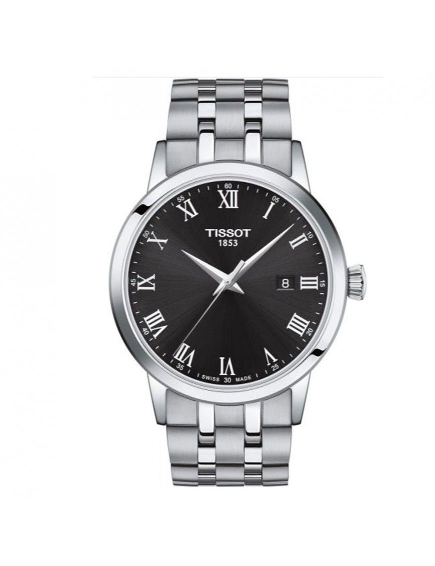 Reloj Tissot Classic Dream Para Hombre T1294101105300, analógico. Esfera negra de 42mm de diámetro, ventana de calendario y números romanos. Movimiento de cuarzo y pulsera de acero. Cristal de zafiro. Sumergible a 5ATM, por lo que es apto para ducha y baño sin inmersión.