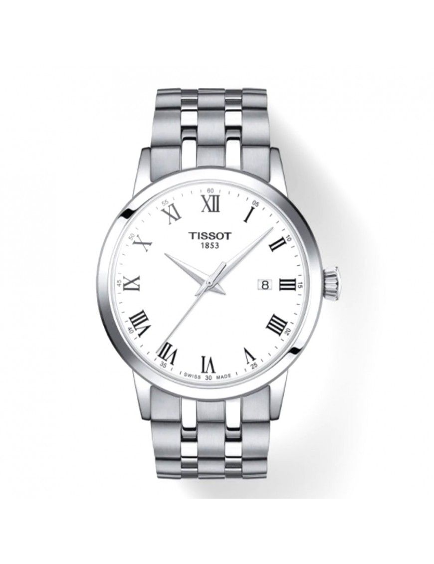 Reloj Tissot Para Hombre Classic Dream T1294101101300, analógico con segundero. Esfera blanca de 42mm de diámetro y ventana de calendario. Numeración romana. Movimiento de cuarzo Swiss Made. Pulsera de acero y cierre mariposa. Cristal de zafiro. Sumergible a 5ATM, por lo que es apto para ducha y baño sin inmersión.