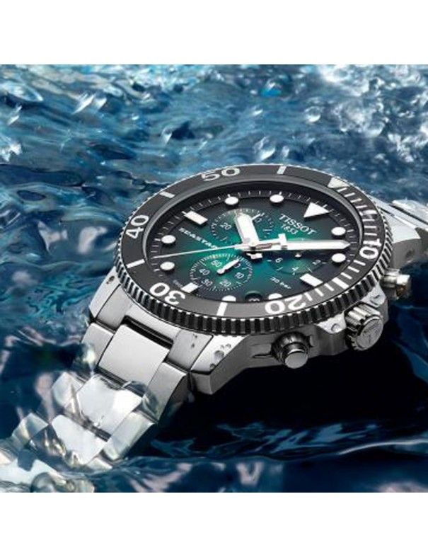 Reloj Tissot Hombre Seastar Crono T1204171109101, analógico cronógrafo con ventana de calendario. Caja de acero de 45mm de diámetro. Pulsera de acero. Cristal de zafiro. Sumergible a 30ATM, por lo que es apto para ducha y baño con inmersión (inmersión con botella).