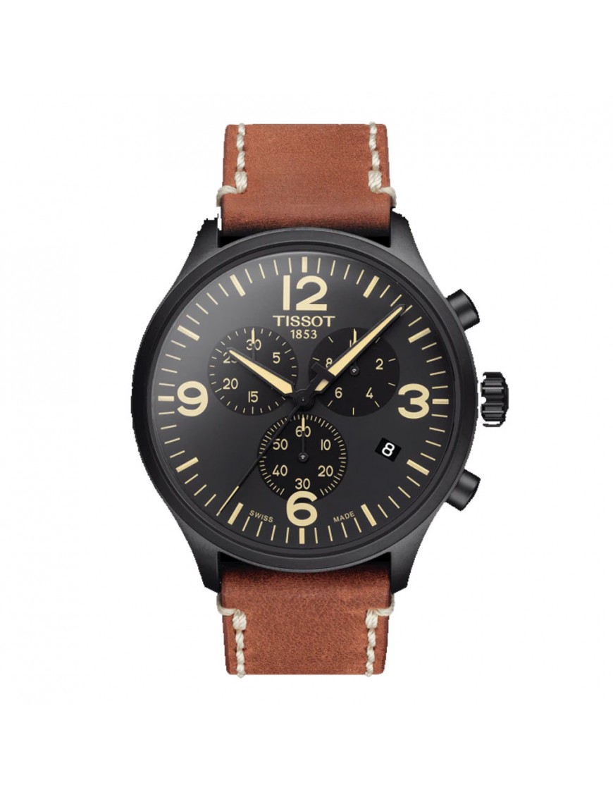 Reloj Tissot Hombre T1166173605700, analógico cronómetro. Caja de acero de 45mm de diámetro. Ventana de calendario. Agujas luminiscentes. Pulsera de piel. Cristal de zafiro. Sumergible a 10ATM, por lo que es apto para ducha y baño con inmersión.