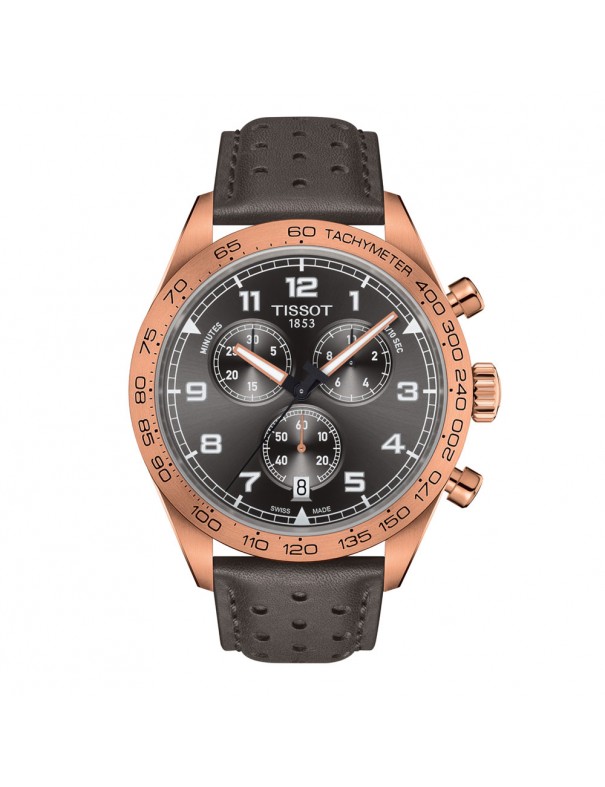 Reloj Tissot Hombre PRS 516 CHRONO T1316173608200, analógico Swiss made. Caja de acero con recubrimiento PVD de oro rosa. 45mm de diámetro. Cristal de zafiro. Correa de piel. Sumergible a 10ATM, por lo que es apto para ducha y baño con inmersión (inmersión con botella).