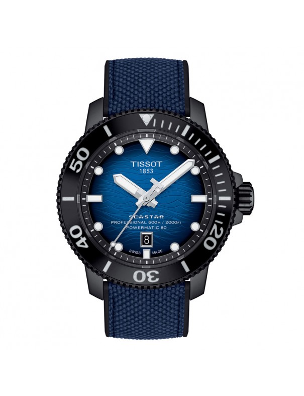 Reloj Tissot Hombre Seastar T1206073704100, analógico de tres agujas. Caja de acero de 46mm de diámetro en color negro. Ventana de calendario. Pulsera de caucho azul. Cristal de zafiro con tratamiento antireflejos. Sumergible a 60ATM, por lo que es apto para buceo profesional.