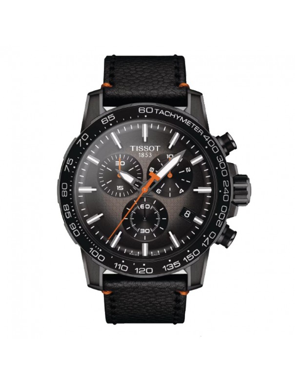Reloj Tissot para hombre super sport T1256173608100. La esfera es de acero con bisel de aluminio y mide 45 mm de diámetro. La pulsera es de piel. Incluye taquímetro, cronógrafo, calendario y cristal zafiro que no se raya. Es sumergible a 10 ATM y permite el buceo sin botella. Garantía de tres años.