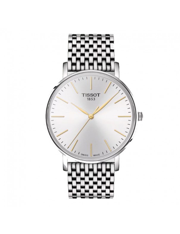 Reloj Tissot Everytime para hombre T1434101101101. La esfera es de acero y mide 40 mm de diámetro. La pulsera es del mismo material con cierre de mariposa con pulsadores. Incluye cristal zafiro que no se raya. Es sumergible a 5 ATM por lo que permite el nado en superficie sin inmersión. Garantía de tres años.