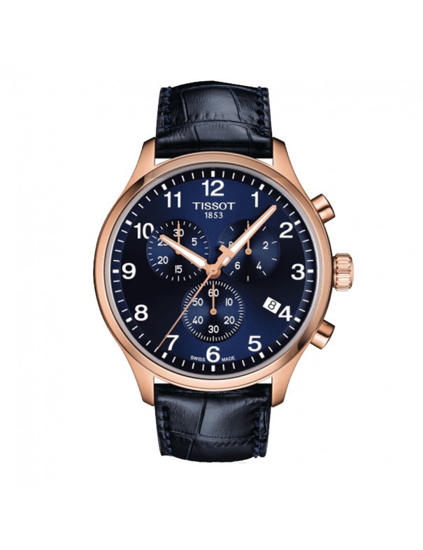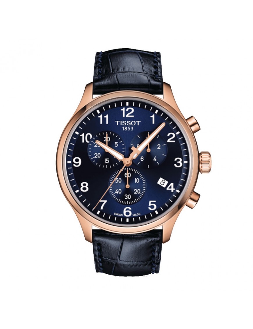 Reloj Tissot crono para hombre T1166173604200. La esfera es de acero rosado de 45 mm de diámetro con pulsera de piel con hebilla. Incluye función cronógrafo, calendario y cristal zafiro que no se raya. Es sumergible a 10 ATM. Garantía de tres años.