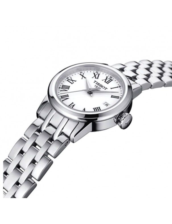 Reloj Tissot Classic Dream Para Mujer T1292101101300, analógico. Esfera de 28mm de diámetro, con ventana de calendario y números romanos. Movimiento de cuarzo y pulsera de acero. Cristal de zafiro. Sumergible a 5ATM, por lo que es apto para ducha y baño sin inmersión.