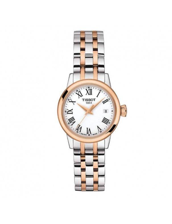 Reloj Tissot Classic Dream Para Mujer T1292102201300, analógico. Esfera de 28mm de diámetro con bisel en color cobrizo, número romanos y ventana de calendario. Movimiento de cuarzo y pulsera de acero bicolor. Cristal de zafiro. Sumergible a 5ATM, por lo que es apto para ducha y baño sin inmersión.