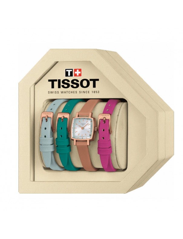 Reloj Tissot Mujer Lovely T0581093603101, analógico de dos agujas. Caja en forma cuadrada de acero en color rosado. Diámetro de 20mm. Cristal de zafiro antireflejos. Acompañado de cuatro correas de piel de diferentes colores intercambiables. Sumergible a 3ATM, por lo que sólo soporta pequeñas salpicaduras.