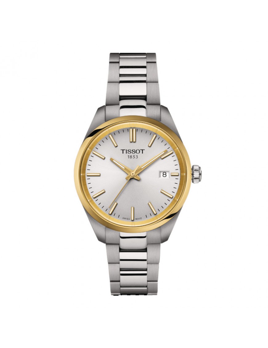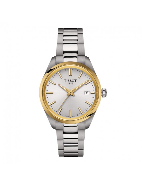 Reloj Tissot PR100 para mujer T1502102103100. La esfera es de acero y mide 34 mm de diámetro. La pulsera es del mismo material y lleva cierre de doble pulsador. Incluye cristal zafiro que no se raya y calendario. Es sumergible a 10 ATM y tiene tres años de garantía.
