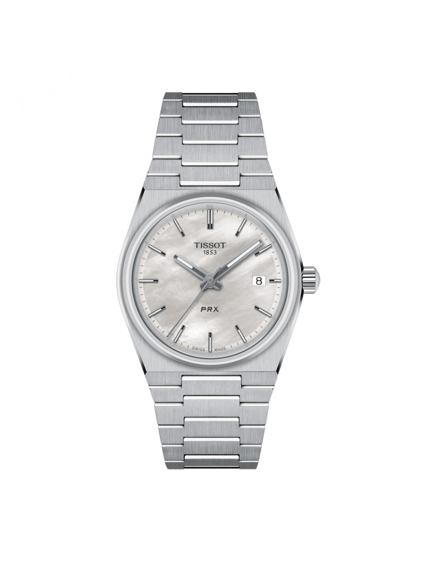Reloj Tissot Mujer PRX T1372101111100 analógico de tres agujas. Caja de acero de 35mm de diámetro. Ventana de calendario , agujas e indicadores luminiscentes Super-Luminova. Esfera de nácar color madreperla blanca. Pulsera de acero. Cristal de zafiro con tratamiento anti reflejos.