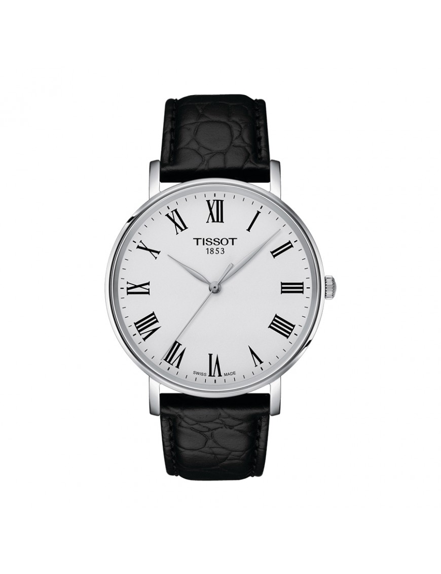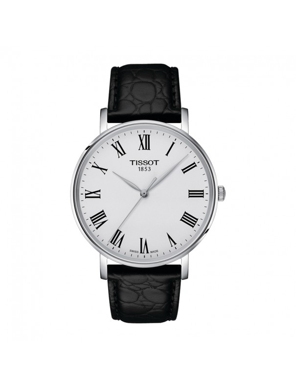Reloj Tissot Everytime para hombre T1434101603300. La esfera es de acero y mide 40mm de diámetro. La pulsera es de piel negra de vacuno granulada estilo cocodrilo. Incluye cristal zafiro que no se raya. Es sumergible a 5 ATM y tiene tres años de garantía.