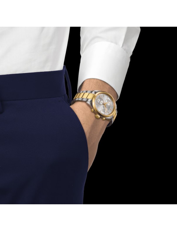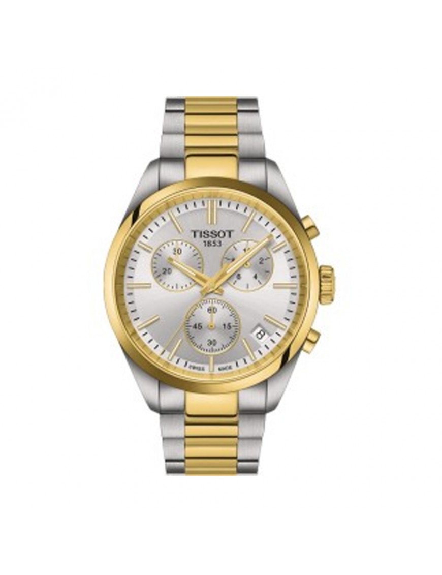 DESCUENTO EN CARRITO Reloj Tissot PR 100 Cronograph para hombre T1504172203100. La pulsera del reloj es de acero inoxidable con revestimiento de PVP de oro amarillo. La esfera es del mismo material y mide 40 mm de diámetro. El cierre es de mariposa de doble pulsador. Cuenta con Cronógrafo, cristal zafiro y calendario.