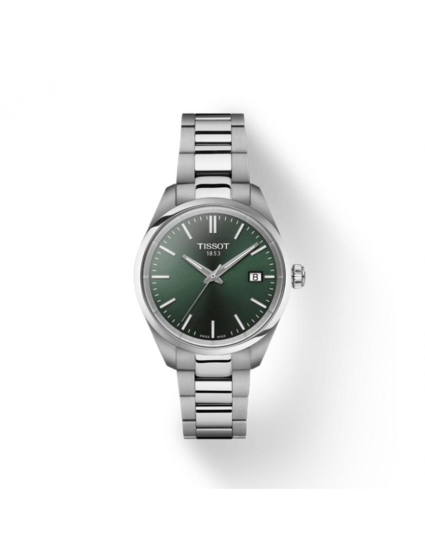 Tissot PR 100 Quartz 34mm T1502101109100. Cuenta con caja de acero inoxidable que lo hace resistente además del cristal de zafiro irrayable. La esfera es de color verde y la correa de acero cuenta con cierre de mariposa con pulsadores. Este modelo tiene un movimiento de cuarzo Swiss made.