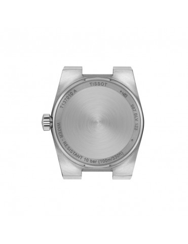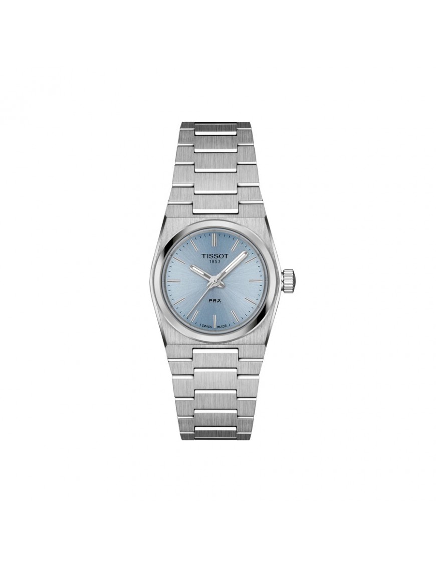 Tissot PRX 25mm T1370101135100. Cuenta con caja de acero, esfera en color azul hielo cubierta por un cristal de zafiro muy resistente. Impulsado por movimiento de cuarzo con función EOL. Correa gris de acero inoxidable con cierre de mariposa de doble pulsador. Resistente al agua hasta 10 bares.