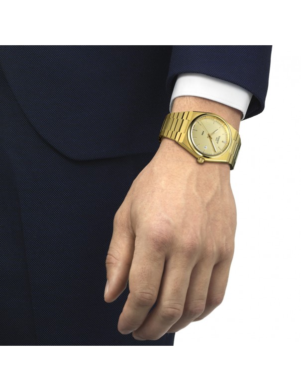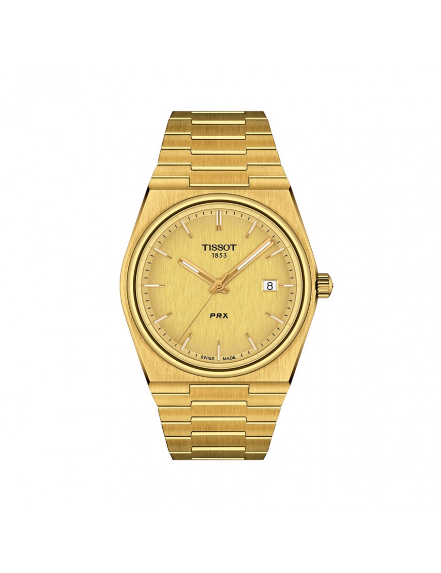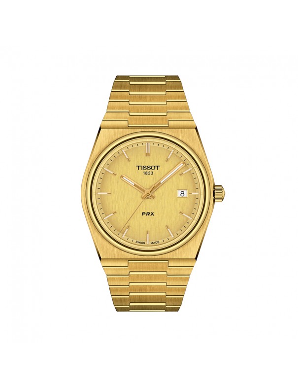 Tissot PRX 40mm T1374103302100. Cuenta con caja de acero, esfera en color champagne cubierta por un cristal de zafiro muy resistente. Impulsado por movimiento de cuarzo con función EOL. Correa en color oro amarillo de acero inoxidable con cierre de mariposa de doble pulsador. Resistente al agua hasta 10 bares. Garantía de 3 años.
