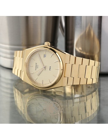 Tissot PRX 40mm T1374103302100. Cuenta con caja de acero, esfera en color champagne cubierta por un cristal de zafiro muy resistente. Impulsado por movimiento de cuarzo con función EOL. Correa en color oro amarillo de acero inoxidable con cierre de mariposa de doble pulsador. Resistente al agua hasta 10 bares.