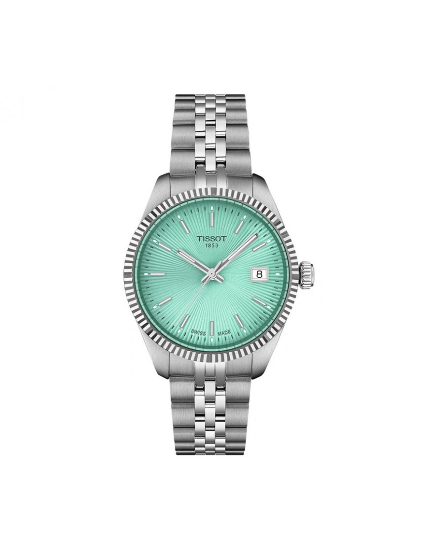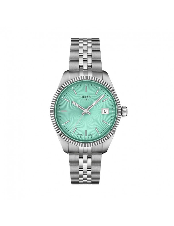 Tissot Ballade 34mm T1562101109100. Cuenta con caja de acero decorado con un bisel estriado con espera en color verde claro cubierta por cristal de zafiro. Presenta un movimiento de cuarzo Swiss. La correa es gris con cierre de mariposa de doble pulsador. Sumergible a 10 bares. Garantía de 3 años.