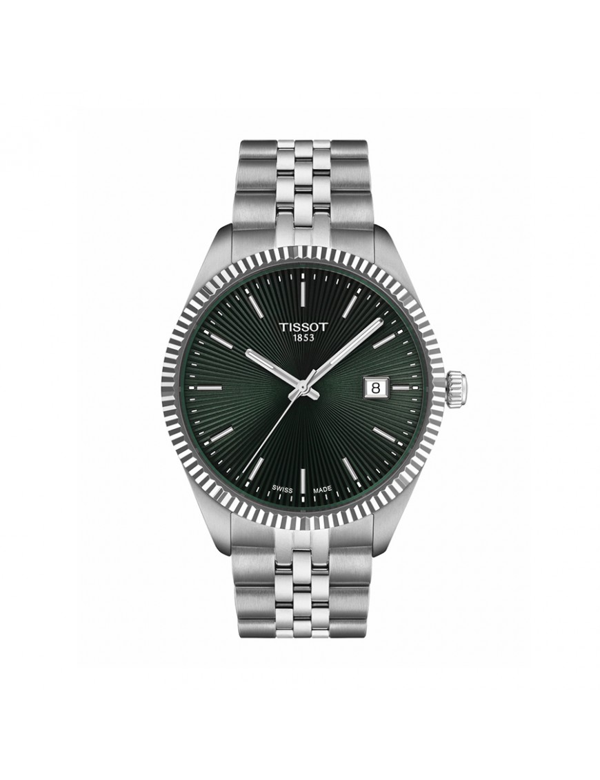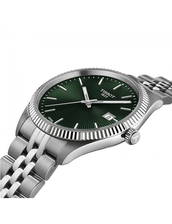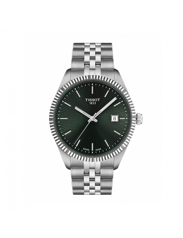 Tissot Ballade 34mm T1564101109100. Cuenta con caja de acero decorado con un bisel estriado con espera en color verde cubierta por cristal de zafiro. Presenta un movimiento de cuarzo Swiss. La correa es gris con cierre de mariposa de doble pulsador. Sumergible hasta una presión de 10 bares. Garantía de 3 años.