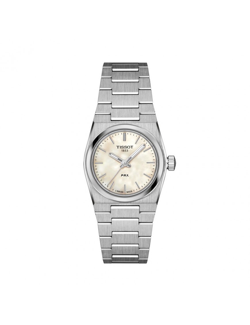 Tissot PRX 25mm T1370101111100. Cuenta con caja de acero, esfera en color madreperla blanca cubierta por un cristal de zafiro muy resistente. Impulsado por movimiento de cuarzo con función EOL. Correa gris de acero inoxidable con cierre de mariposa de doble pulsador. Resistente al agua hasta 10 bares.