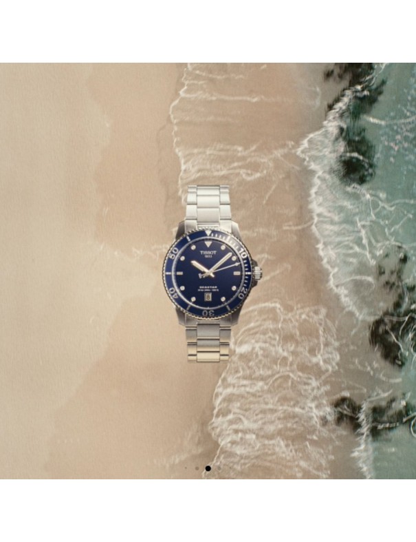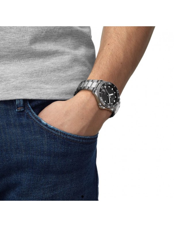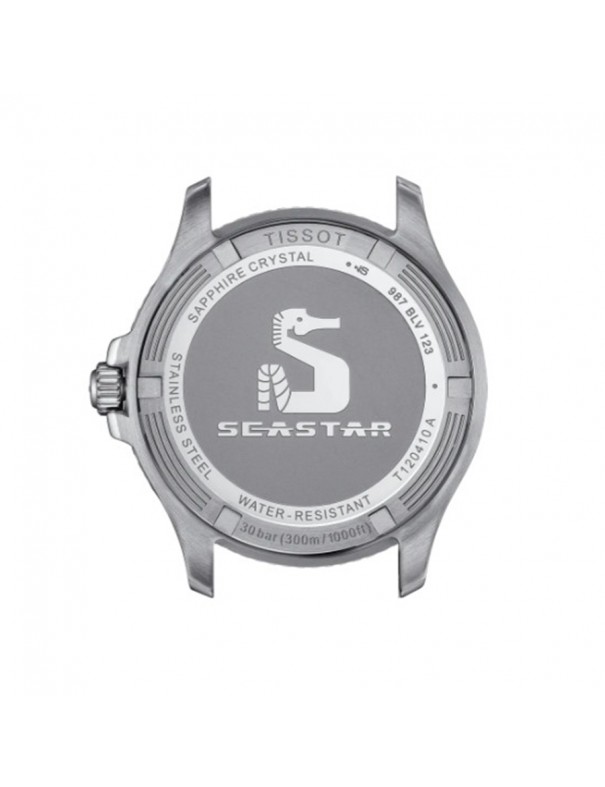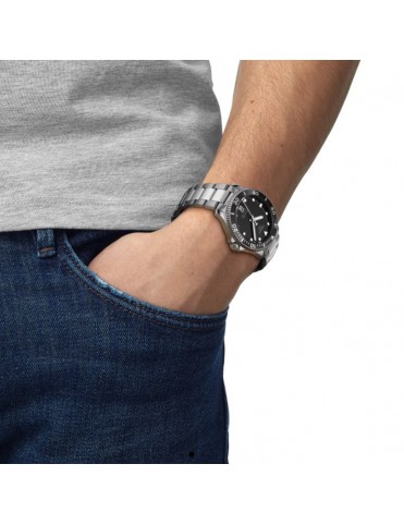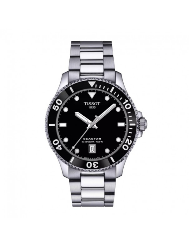 Reloj TISSOT Seastar 1000 40mm T1204101105100. Caja de acero inoxidable en color plata, esfera negra y correa de acero inoxidable con cierre desplegable por pulsadores. Funciona con movimiento de cuarzo suizo y ofrece las funciones fecha y EOL (indicador fin de vida de batería). Resistente al agua hasta 30 bar.