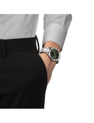 Reloj TISSOT PR 100 40mm Verde T1504101109100. Caja de acero inoxidable 316L en acabado plateado con esfera verde profundo, pulsera de acero a juego con cierre desplegable tipo mariposa con pulsadores; movimiento de cuarzo suizo con indicador de fin de vida de la batería (EOL), funciones de horas, minutos, segundos y fecha; sumergible hasta 10 bar.