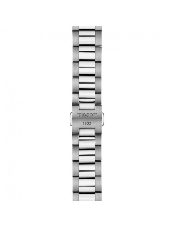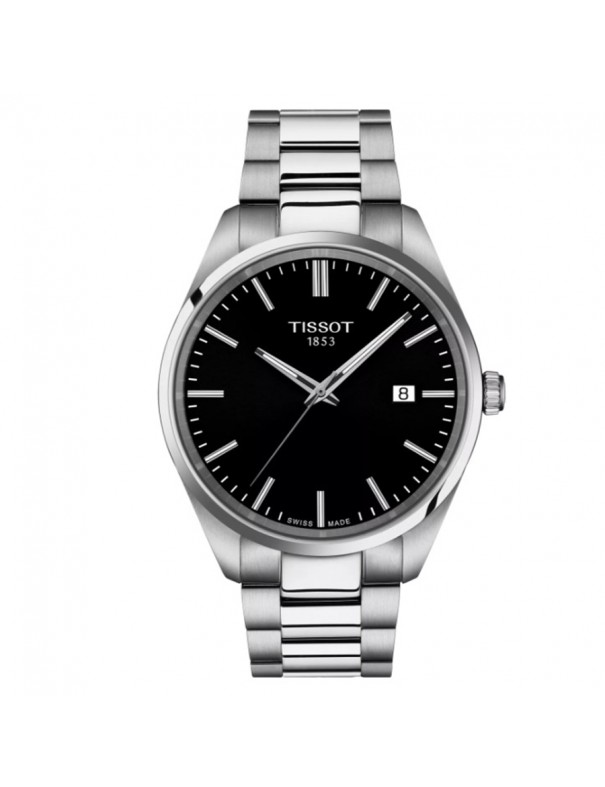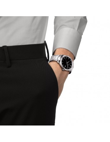 Reloj TISSOT PR 100 40mm Negro T1504101105100. Caja de acero inoxidable 316L en acabado plateado con esfera negra, pulsera de acero a juego con cierre desplegable tipo mariposa con pulsadores; movimiento de cuarzo suizo con indicador de fin de vida de la batería (EOL), funciones de horas, minutos, segundos y fecha; sumergible hasta 10 bar.
